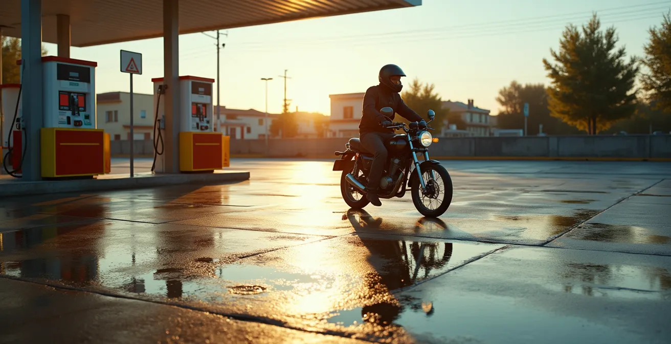 El consejo habitual que oirás es «ten cuidado» o «mira bien dónde pisas». Pero eso no es una estrategia, es una lotería. Como instructor, te digo que la seguridad en parado no depende de la suerte, sino de un sistema. Un sistema que empieza mucho antes de llegar a la gasolinera, en la elección de tu calzado, y termina en el control milimétrico de tu embrague y tu equilibrio. Olvídate de los consejos genéricos que te han dado hasta ahora.